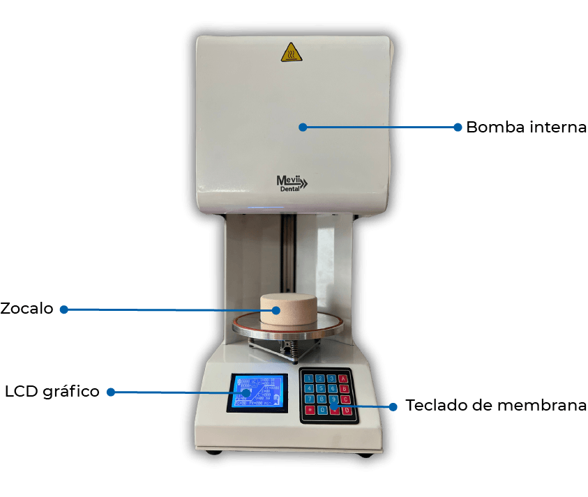 Equipo para cocción de porcelana y estratificado, sistema programable con capacidad de memoria para 20 programas, permite una cocción homogénea y garantiza la precisión deseada en cuanto al control de temperatura, resulta intuitiva y fácil de usar, cuenta con LCD gráfico y teclado de membrana.
